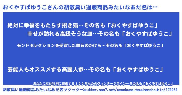 | 男性向けラノベタイトル風あだ名 | 『おくやすばゆうこ~年齢イコール彼女いない歴の魔法使い~』 |