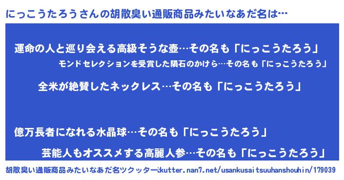 | 男性向けラノベタイトル風あだ名 | 『うちのにっこうたろうが世界を掌握している!』 |