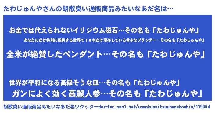 | 男性向けラノベタイトル風あだ名 | 『たわじゅんやの嫁は女の子じゃないと思った?』 |