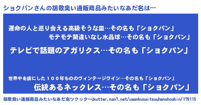 | 男性向けラノベタイトル風あだ名 | 『転生したらショクパンだった件』 |