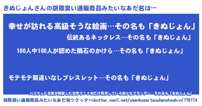 | 男性向けラノベタイトル風あだ名 | 『キヌジョンスレイヤー』 |