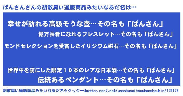 | ヒーロー風カッコイイあだ名 | 『慈愛の使者ばんさん』『黄金騎士バン』 |