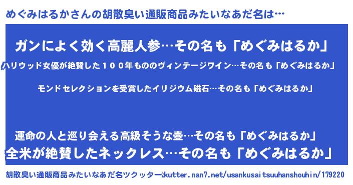 | 男性向けラノベタイトル風あだ名 | 『めぐみはるか~年齢イコール彼女いない歴の魔法使い~』 |