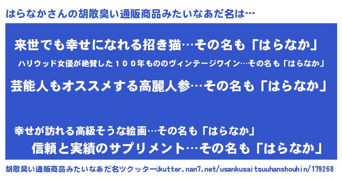 | 男性向けラノベタイトル風あだ名 | 『はらなか~年齢イコール彼女いない歴の魔法使い~』 |