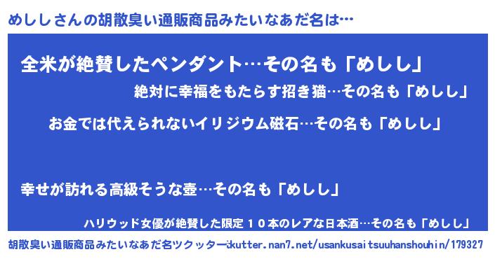 | ヒーロー風カッコイイあだ名 | 『慈愛の使者めしし』『幻影騎士メシ』 |