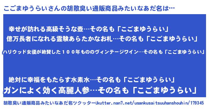 | 意味不明あだ名 | 『住所不定無職こごまゆうらい(2歳)』 |