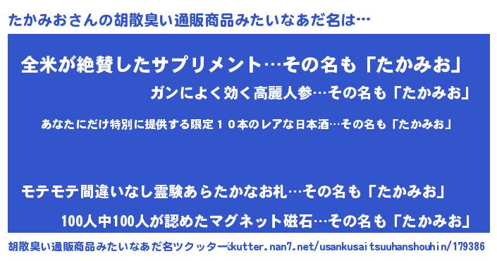 | 男性向けラノベタイトル風あだ名 | 『この素晴らしい世界にたかみおを!』 |