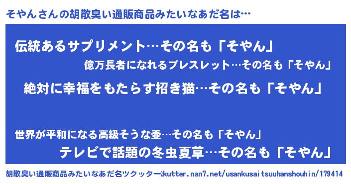 | 男性向けラノベタイトル風あだ名 | 『そやんという概念が存在しない退屈な世界 』 |