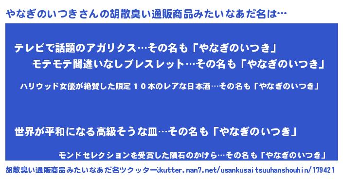 | 恥ずかしいあだ名 | 『ヤナギノイツキデラックス』『やなちん』 |