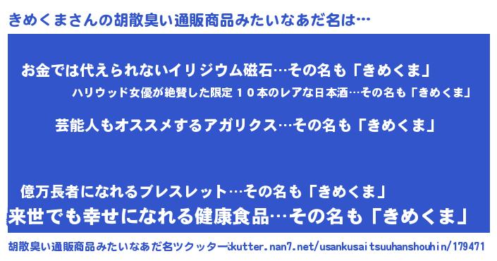 | 意味不明あだ名 | 『自称きめくま』『しいたけ科きめくま属』 |