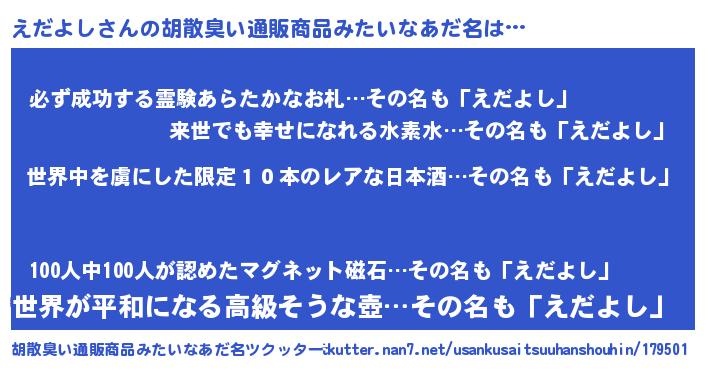 | 意味不明あだ名 | 『住所不定無職えだよし(47歳)』 |