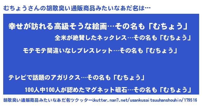 | 意味不明あだ名 | 『ペロリンむちょう』『自称むちょう』 |