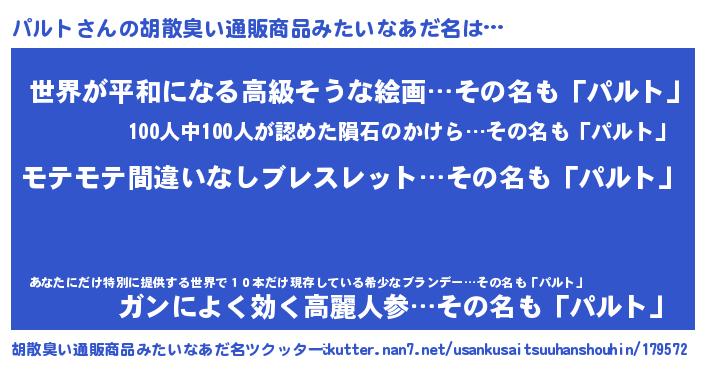 | 男性向けラノベタイトル風あだ名 | 『パルトの憂鬱』『パルトスレイヤー』 |