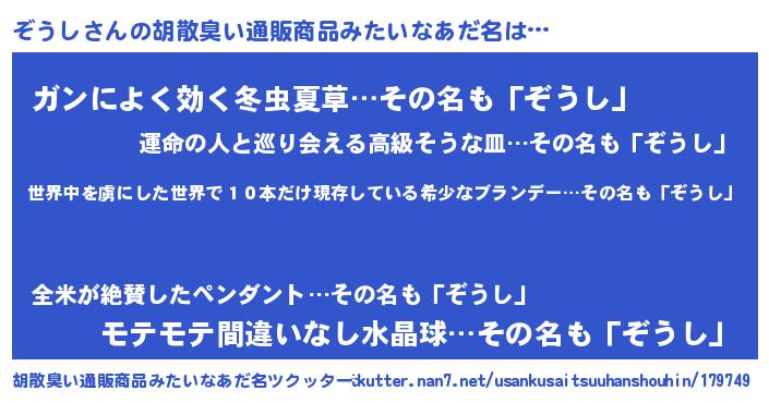 | 意味不明あだ名 | 『住所不定無職ぞうし(93歳)』『自称ぞうし』 |