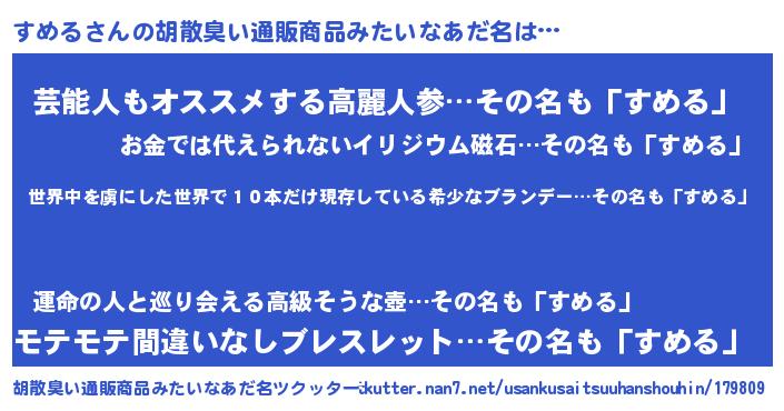 | 意味不明あだ名 | 『住所不定無職すめる(74歳)』『自称すめる』 |