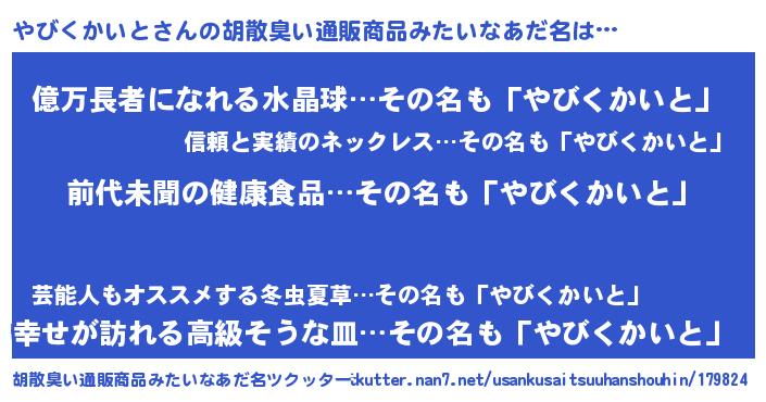 | ヘコむあだ名 | 『やびくかいと(笑)』『やびにゅー』 |