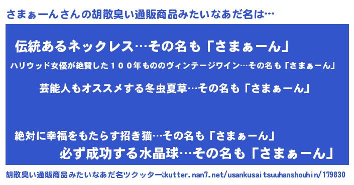 | 男性向けラノベタイトル風あだ名 | 『Re:さまぁーんから始める異世界生活』 |