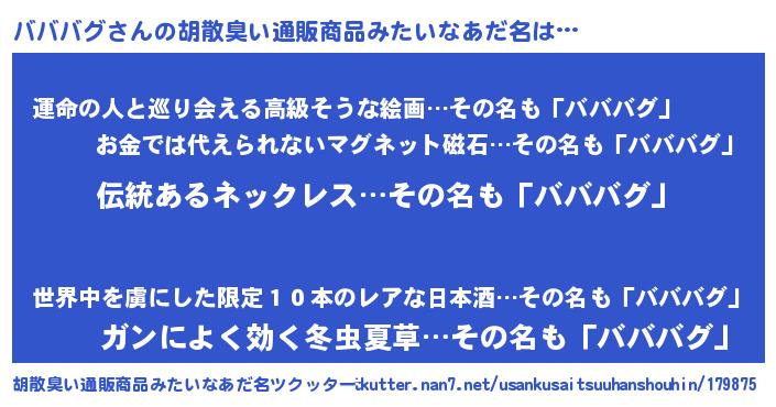 | 男性向けラノベタイトル風あだ名 | 『バババグの嫁は女の子じゃないと思った?』 |