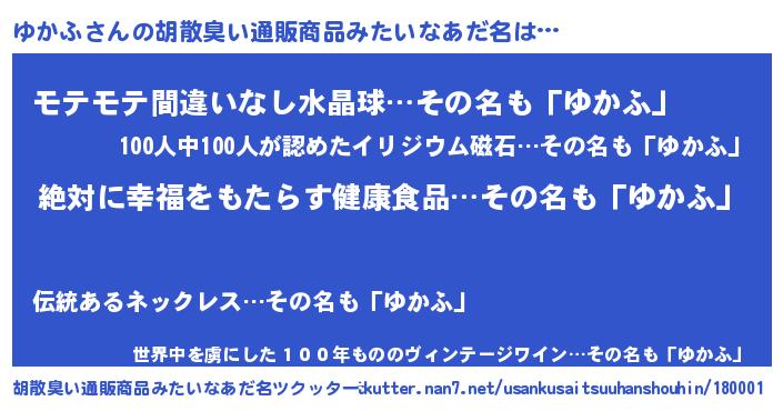 | 女子向けラノベタイトル風あだ名 | 『異世界で失敗しない100のゆかふ』 |