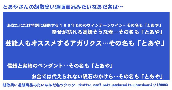 | 恥ずかしいあだ名 | 『トアヤデラックス』『とあっちょ』 |