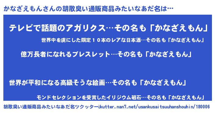| 男性向けラノベタイトル風あだ名 | 『かなざえもん~年齢イコール彼女いない歴の魔法使い~』 |