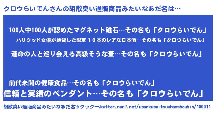 | 意味不明あだ名 | 『クロウらいでんフォーエバー』 |