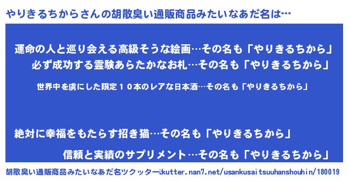 | 意味不明あだ名 | 『住所不定無職やりきるちから(43歳)』 |