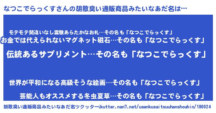 | 欧米人風あだ名 | 『ウサインなつこでらっくす』 |