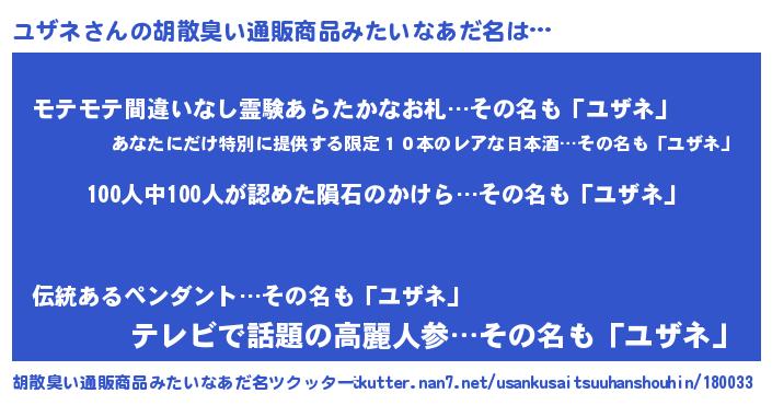 | 男性向けラノベタイトル風あだ名 | 『おまえをオタクにしてやるから、俺をユザネにしてくれ! 』 |