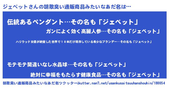 | 意味不明あだ名 | 『住所不定無職ジェベット(91歳)』 |