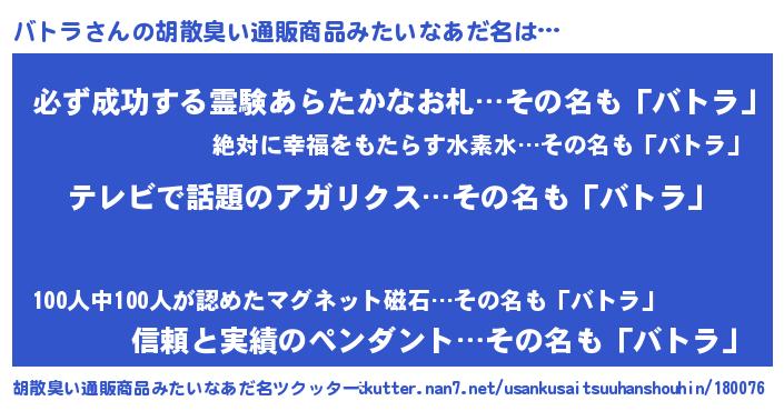 | ヘコむあだ名 | 『バトにゅー』『バトっぺ』『つくし』 |