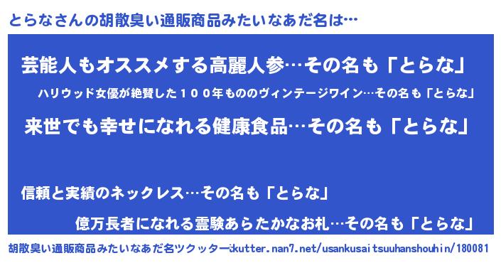 | 恥ずかしいあだ名 | 『とらちん』『トラナデラックス』 |