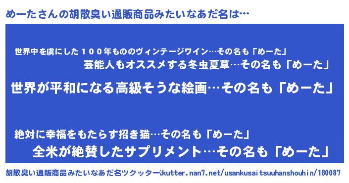 | 女子向けラノベタイトル風あだ名 | 『めーた伯爵の花嫁』『めーた様がみてる』 |