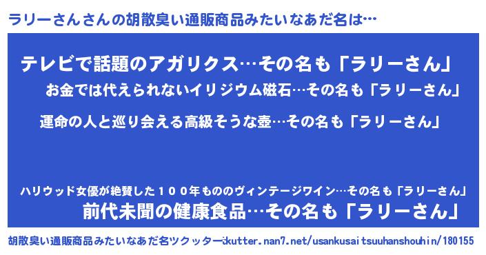 | 男性向けラノベタイトル風あだ名 | 『ラリーさん~年齢イコール彼女いない歴の魔法使い~』 |