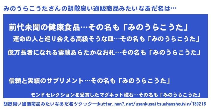 | 男性向けラノベタイトル風あだ名 | 『うちのみのうらこうたが世界を掌握している!』 |
