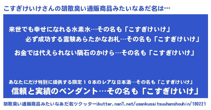 | ヘコむあだ名 | 『こすぎけいけ(遠い目)』『こすっちょ』 |