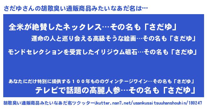 | 女子向けラノベタイトル風あだ名 | 『死神さだゆの再婚』『さだゆ様がみてる』 |