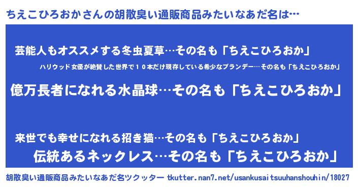 | 男性向けラノベタイトル風あだ名 | 『うちのちえこひろおかが世界を掌握している!』 |