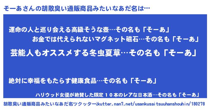 | 意味不明あだ名 | 『自称そーあ』『そーあフォーエバー』 |