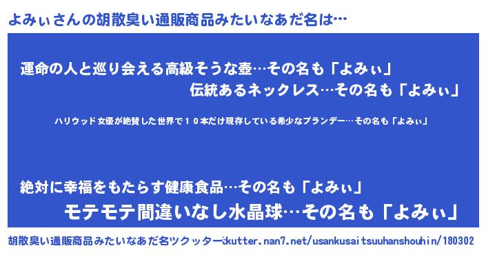 | 意味不明あだ名 | 『住所不定無職よみぃ(86歳)』 |