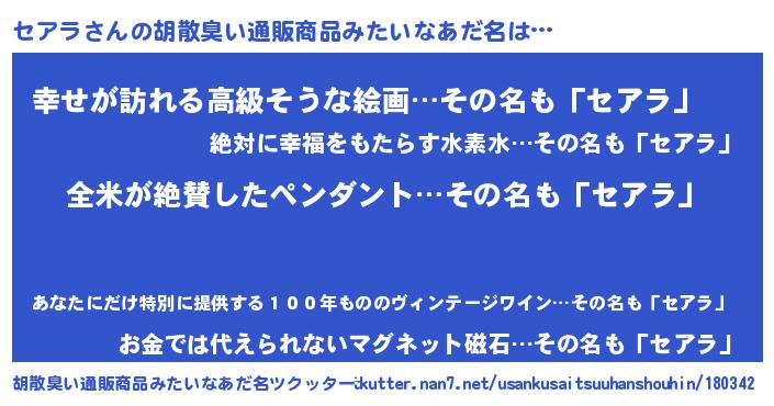 | 意味不明あだ名 | 『とにかく怪しいセアラ』 |