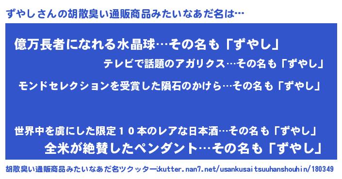 | 男性向けラノベタイトル風あだ名 | 『ずやしに滅ぼされるだけの簡単なお仕事です』 |
