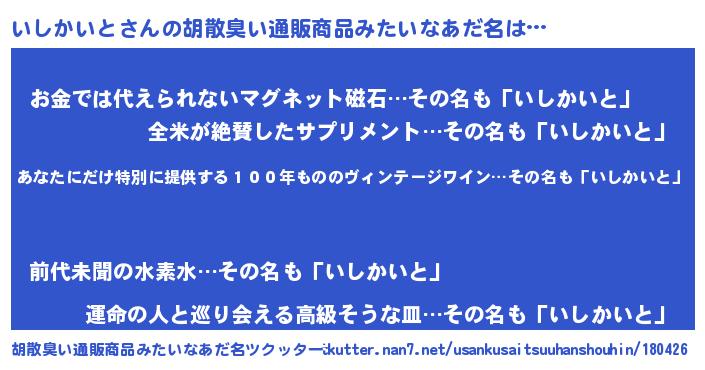 | 男性向けラノベタイトル風あだ名 | 『この素晴らしい世界にいしかいとを!』 |