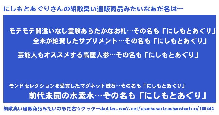 | 男性向けラノベタイトル風あだ名 | 『にしもとあぐり~年齢イコール彼女いない歴の魔法使い~』 |