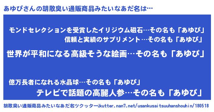 | ヒーロー風カッコイイあだ名 | 『ウルトラあゆぴマン』『最強戦士アユピ』 |