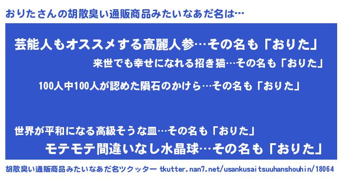 | 意味不明あだ名 | 『めかぶ科おりた属』『自称おりた』 |