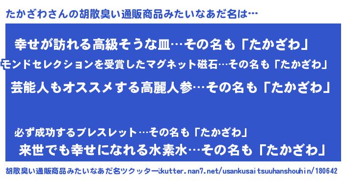 | 男性向けラノベタイトル風あだ名 | 『Re:たかざわから始める異世界生活』 |
