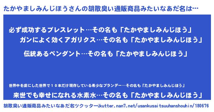 | 意味不明あだ名 | 『とにかく怪しいたかやましみんじほう』 |