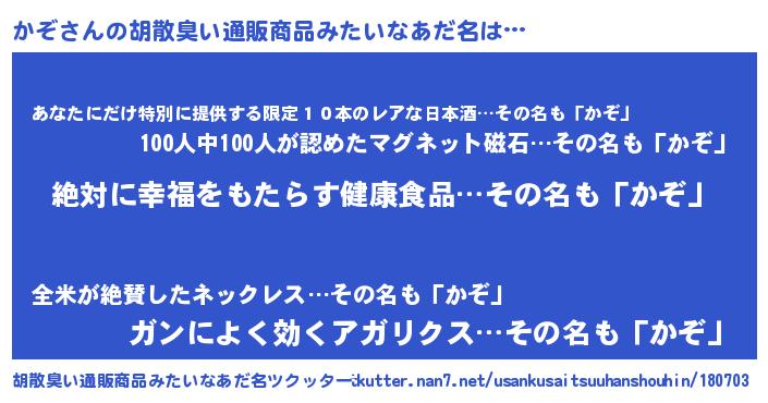| 欧米人風あだ名 | 『ダルビッシュかぞ』『ダレノガレかぞ』 |