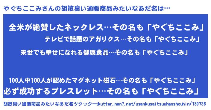 | ヘコむあだ名 | 『やぐちここみ(苦笑)』『やぐっぺ』 |